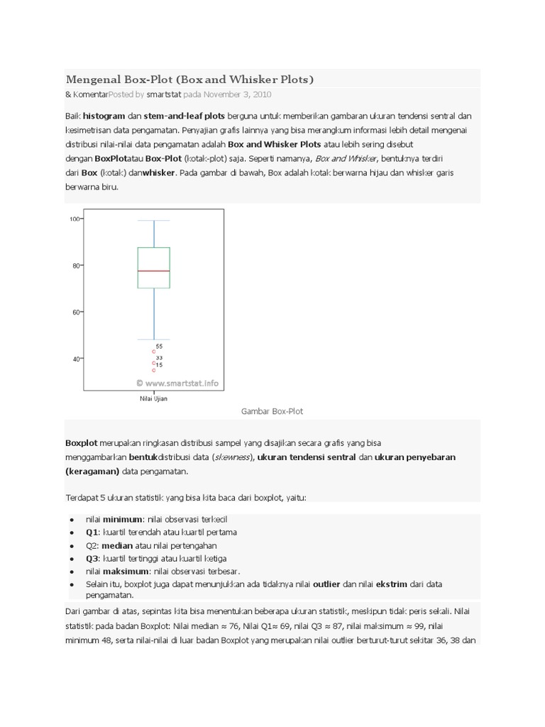 Understanding Boxplots: How to Read and Interpret a Boxplot |... Aug 09, 2022 · A boxplot is a graph that gives you a good indication of how the values in the data are spread out. Although boxplots may seem primitive in comparison to a histogram or density plot, they have the advantage of taking up less space, which is useful when comparing distributions between many groups or data sets. Box Plot Explained: Interpretation, Examples, & Comparison In descriptive statistics, a box plot or boxplot (also known as box and whisker plot) is a type of chart often used in explanatory data analysis. Box plots visually show the distribution of numerical data and skewness through displaying the data quartiles (or percentiles) and averages.